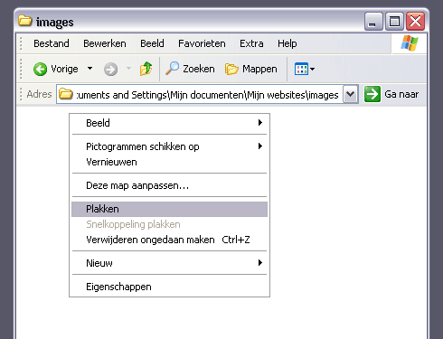 Vervolgens gaat u naar de webmap, open de map images, klik op de rechtermuisknop en kies voor plakken.